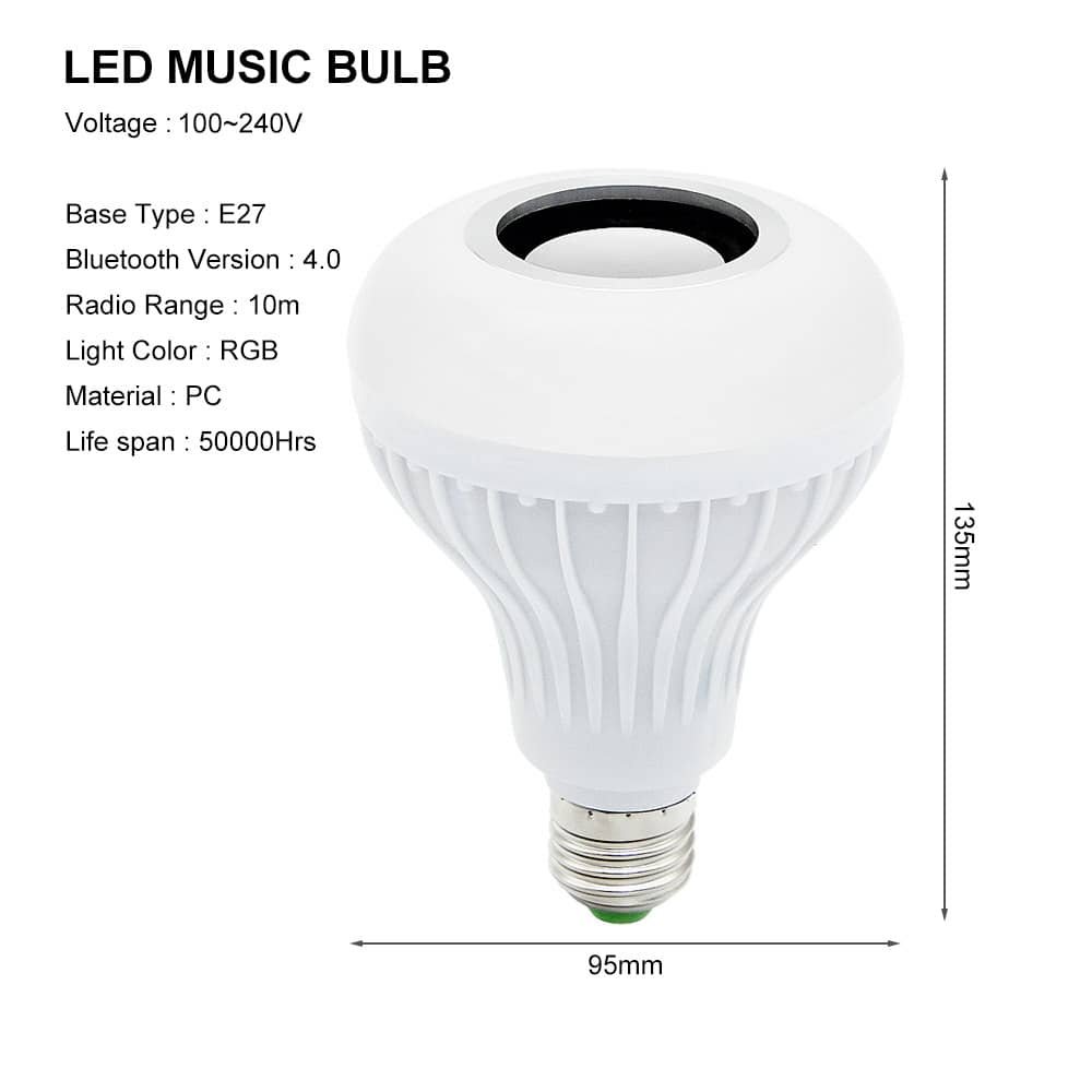 لمبة LED بلوتوث مع سماعة موسيقية (E27)الخامة: بلاستيك.لون الهيكل: أبيض.لون الإضاءة: RGB.الطاقة: 12 واط (LED 7 واط + سماعة 5 واط).التردد: 135 هرتز – 15 كيلوهرتز.إصدار البلوتوث: 3.0، بمدى يصل حتى 10 أمتار.الحجم: تقريباً 9.4 × 13.2 سم.طريقة الاستخدام:تثبيت اللمبة على قاعدة E27 وتشغيلها.التحكم في الألوان والمودات عبر الريموت.توصيل البلوتوث من الهاتف أو الجهاز اللوحي لتشغيل الموسيقى.المرفقات: لمبة LED بلوتوث + ريموت تحكم بـ 24 زر.