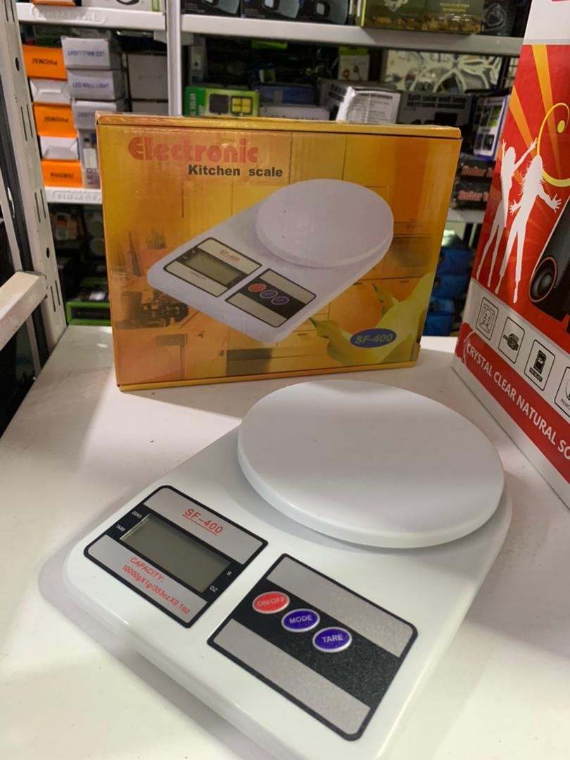 ميزان إلكتروني SF-400السعة: 1 كغ / 5 كغ / 10 كغ، الدقة: 1 غرام.الخامة: بلاستيك ABS.أزرار لمسية، وحدات القياس: g، lb، oz.شاشة LCD بحجم 45×21 ملم.يعمل ببطاريتين AAA (غير مرفقة مع العبوة).الأبعاد: المنتج 24×17 سم، قطر الصحن 14.8 سم.الوزن: 420 غرام (مع التغليف).نظام 4 حساسات عالية الدقة.مؤشر حمل زائد ومؤشر انخفاض البطارية.خاصية الإيقاف التلقائي والتصفير التلقائي.مصنوع من البلاستيك والإلكترونيات مع صحن من الفولاذ المقاوم للصدأ.العبوة تحتوي على ميزان إلكتروني واحد.