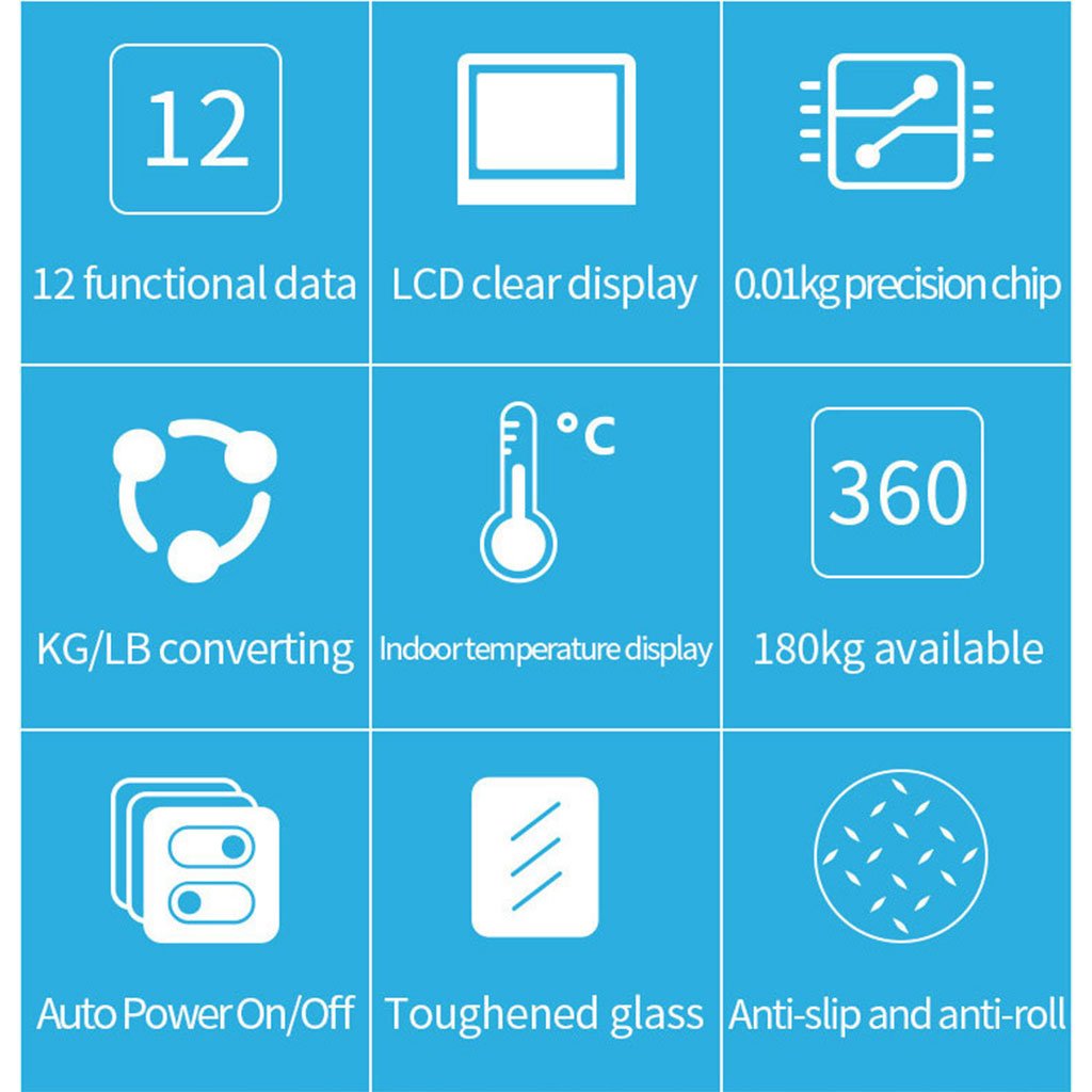 ⚖️ ميزان ذكي لتحليل وزن الجسم والدهون 📱 اتصال بتطبيق الهاتف الذكي يعرض 79 نوعًا من البيانات الصحية، يساعدك على مراقبة تقدمك ووضع خطة فعالة لخسارة الوزن.🧠 تحليل ذكي ودقيق مزود بشريحة ذكية لعرض بيانات الوزن، ونسبة الدهون، ودرجة الحرارة الحالية.🏠 تصميم أنيق وآمن حواف مستديرة غير مؤذية، قاعدة مانعة للانزلاق، يمكن وضعه في أي مكان من المنزل.🔋 يعمل ببطاريتين AAA سهل التشغيل مع عمر بطارية طويل، ويقيس من 3 حتى 180 كجم.🧬 جودة عالية مصنوع من زجاج مقوّى متين وآمن للاستخدام اليومي