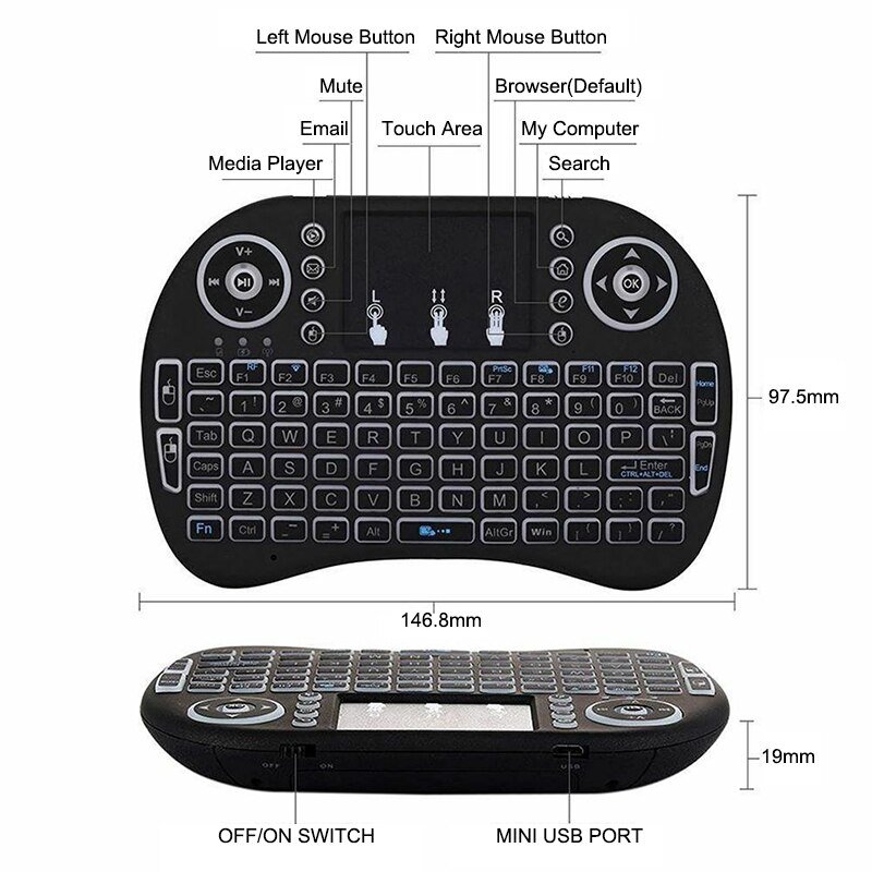 المميزات:يمكن توصيله بجهاز كمبيوتر مكتبي، كمبيوتر محمول، تلفاز السيارة، HTPC، شاشة كبيرة، تلفاز ذكي، مشغل شبكي، جهاز استقبال Android أو X-BOX.لوحة مفاتيح لاسلكية محمولة ومريحة بلمسة وتصميم أنيق.لوحة مفاتيح QWERTY تضم 92 مفتاحاً.تصميم مريح بمظهر أنيق.لوحة لمس أكبر مع زرين لمحاكاة الفأرة.مصنوعة من مواد صديقة للبيئة ومتوافقة مع معايير ROHS.تقنية مطابقة ذكية تمنع فقدان جهاز الاستقبال.مفاتيح تشغيل سريعة لاستخدام أسهل.المواصفات:المادة: بلاستيكنطاق الإرسال: حتى 10 أمتارجهد التشغيل: 3.3 فولتتيار التشغيل: أقل من 50mAتيار الشحن: أقل من 300mAتيار وضع السكون: أقل من 1mAنوع البطارية: ليثيوم قابلة لإعادة الشحننوع الشحن: USBأنظمة التشغيل المتوافقة: Windows 2000/XP/Vista/CE/7/8/10، Linux، Androidنطاق تردد الاستجابة: 2.403GHz ~ 2.480GHzاللون: أسودالأبعاد: 14.68 × 9.75 × 1.9 سممحتويات العبوة:1 × لوحة مفاتيح لاسلكية