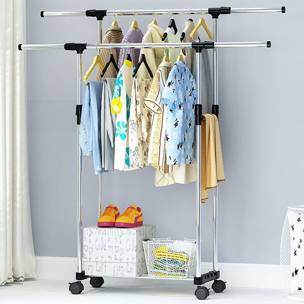 Double Penderie à vêtements portable à roulettes en Acier Inoxydable – علاقة ملابس متنقلة