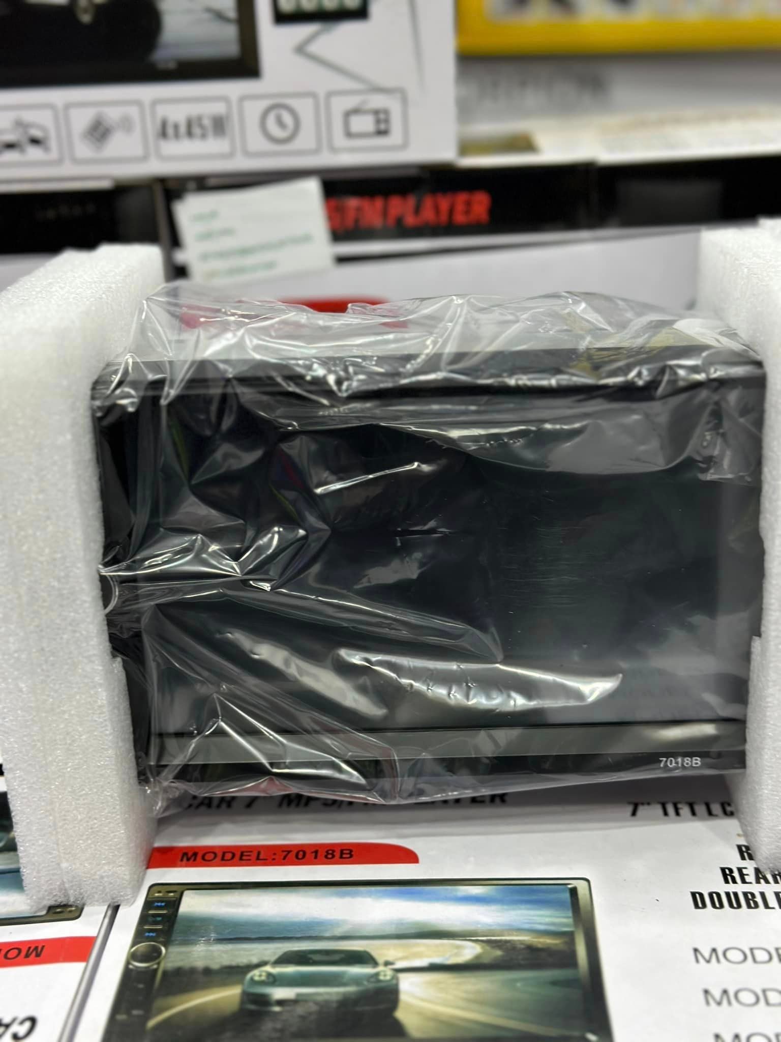 جهاز DVD للسيارة (موديل 7018B)الميزات:التحويل التلقائي إلى صورة الرجوع عند السير للخلفدعم الاتصال الثنائي لهواتف الأندرويد، والاتصال الأحادي لهواتف iOSإمكانية تغيير إضاءة الشاشة بسبعة ألوانالمواصفات:نظام التشغيل: Winceحجم الشاشة: 7 بوصة بدقة ‎1024×600‎الصوت: ‎MP3 / WMA / AV / OGG / FLAC / APE‎الفيديو: ‎RM / RMVB / MP4 / FLV / MKV / 3GP / AVI / ASF / SWFMP1/MP2‎راديو: FM1, FM2, FM3 بتردد ‎87.5M-108M‎رقاقات: Quanzhi C500 (فك ترميز)، TDA7388 (مضخم صوت)، QN8035 (راديو)منافذ: ‎2 Video Out‎، ‎1 Rear In‎، ‎2 Audio Out‎، ‎1 Video In‎دعم أوامر المقود، وفتحة كرت ذاكرةالأبعاد: ‎178×102×58 مم‎لا يدعم GPSمحتوى العبوة:مشغل DVDكابل طاقةجهاز تحكم عن بعددليل استخدام باللغة الإنجليزية
