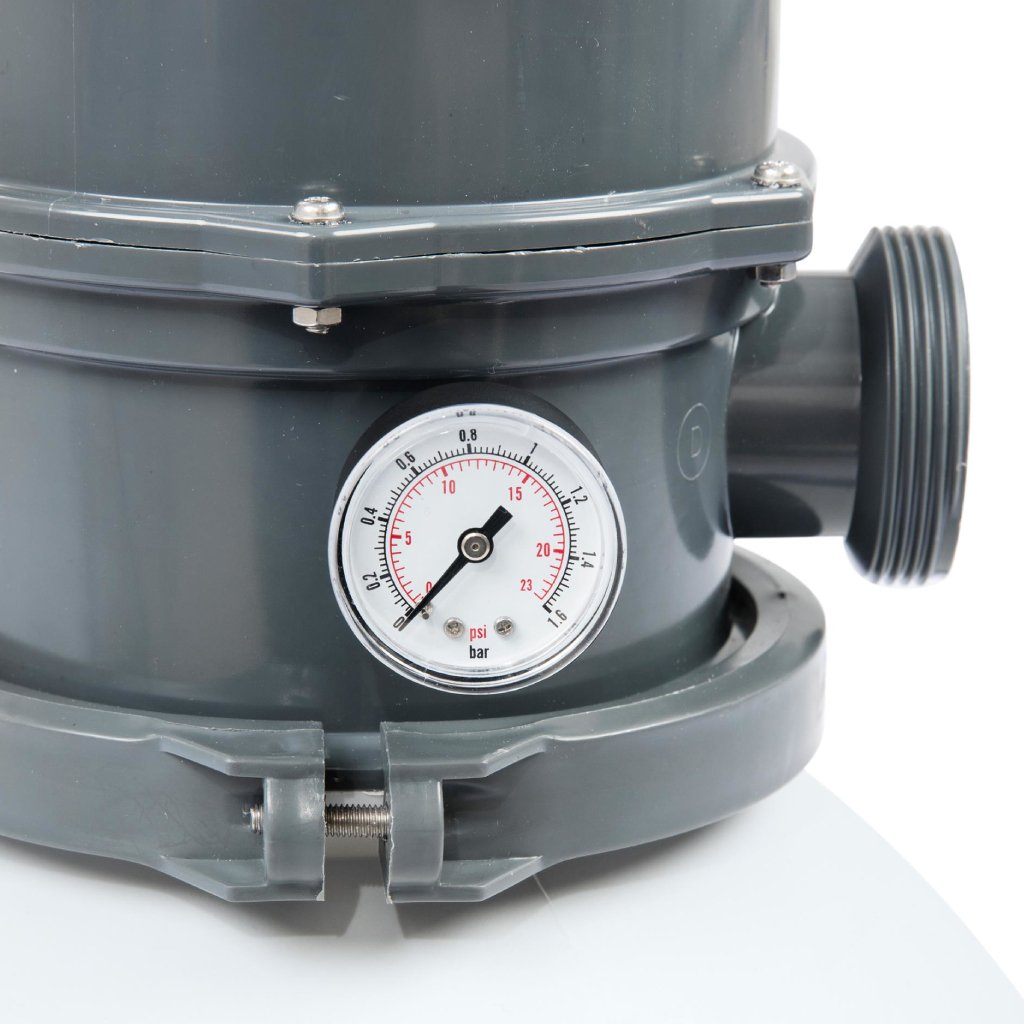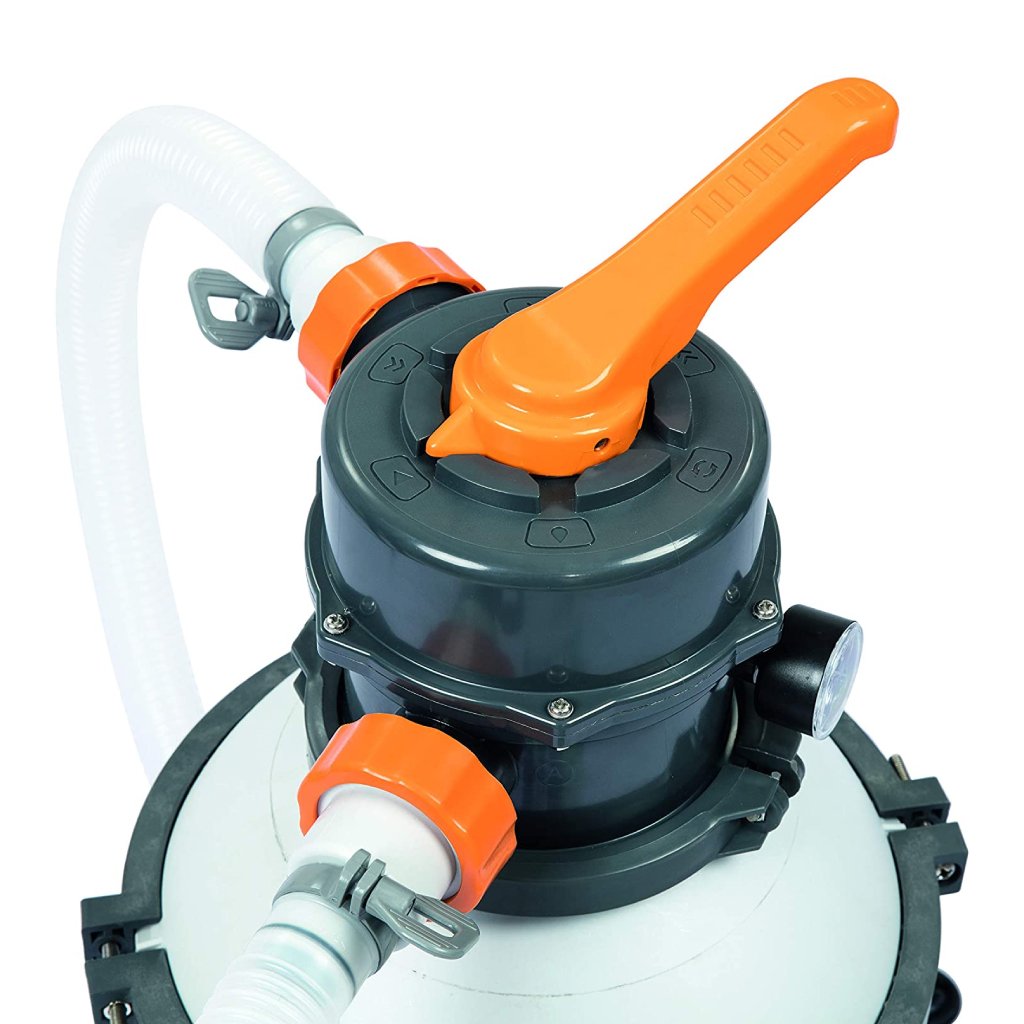 مضخة فلترة بالرمل من Bestway للمسابحلتنقية ميكانيكية للماء باستخدام رمل كوارتز مُنخل (0.45 – 0.85 مم).تحتوي الوحدة على مضخة، وصمام بست وضعيات لتغيير أنماط التشغيل، وعداد ضغط.أبرز المزايا:تنقية أفضل من المضخات ذات فلاتر الورق.استبدال الرمل كل 2 – 3 أشهر فقط.قدرة ضخ 3,028 لتر/ساعة.خزان مقاوم للتآكل.فلتر داخلي يجمع الأوساخ.موزع ChemConnect مدمج.المواصفات:أداء المضخة: 3,028 لتر/ساعة.أداء النظام: 2,006 لتر/ساعة.الحجم المناسب للمسابح: 1,000 – 16,000 لتر.سعة الخزان: 8.5 كجم من الرمل أو 240 جم من كرات Polysphere (تُشترى منفصلة).استهلاك الطاقة: 85 واط – جهد 220 فولت.الوزن بدون رمل: 8 كجم.