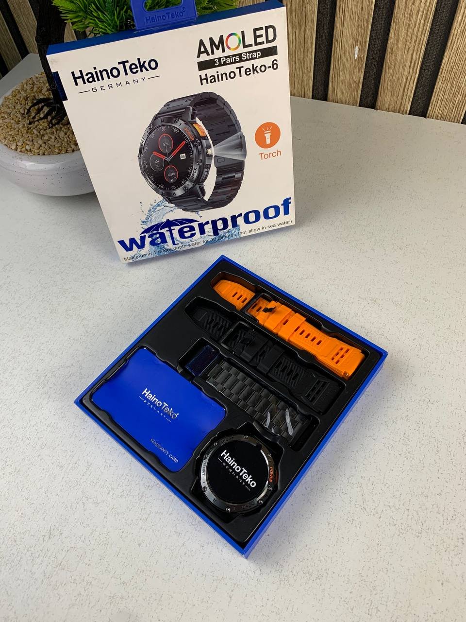 HainoTeko-6 avec écran AMOLED 3 paires de bracelets et lampe torche intégrée – ساعة ذكية أصلية