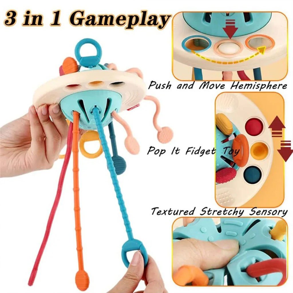 لعبة تعليمية للأطفال بعمر سنةأربع ألعاب في واحدة: لعبة شد الحبل، لعبة الخشخيشة، لعبة النوافذ المنبثقة، وأزرار انزلاقية.مواد آمنة: مصنوعة من سيليكون غذائي وABS، خالية من BPA ومعتمدة من CPSIA وASTM F963.تطوير المهارات: تساعد على تنمية المهارات الحركية الدقيقة، تقوية عضلات اليد، التعرف على الألوان، وفهم العلاقة بين السبب والنتيجة.لعبة تسنين آمنة: الحبال اللينة تعمل أيضاً كلعبة تسنين ممتازة.مثالية للسفر: خفيفة الوزن وسهلة الحمل لإشغال الطفل أثناء التنقل.