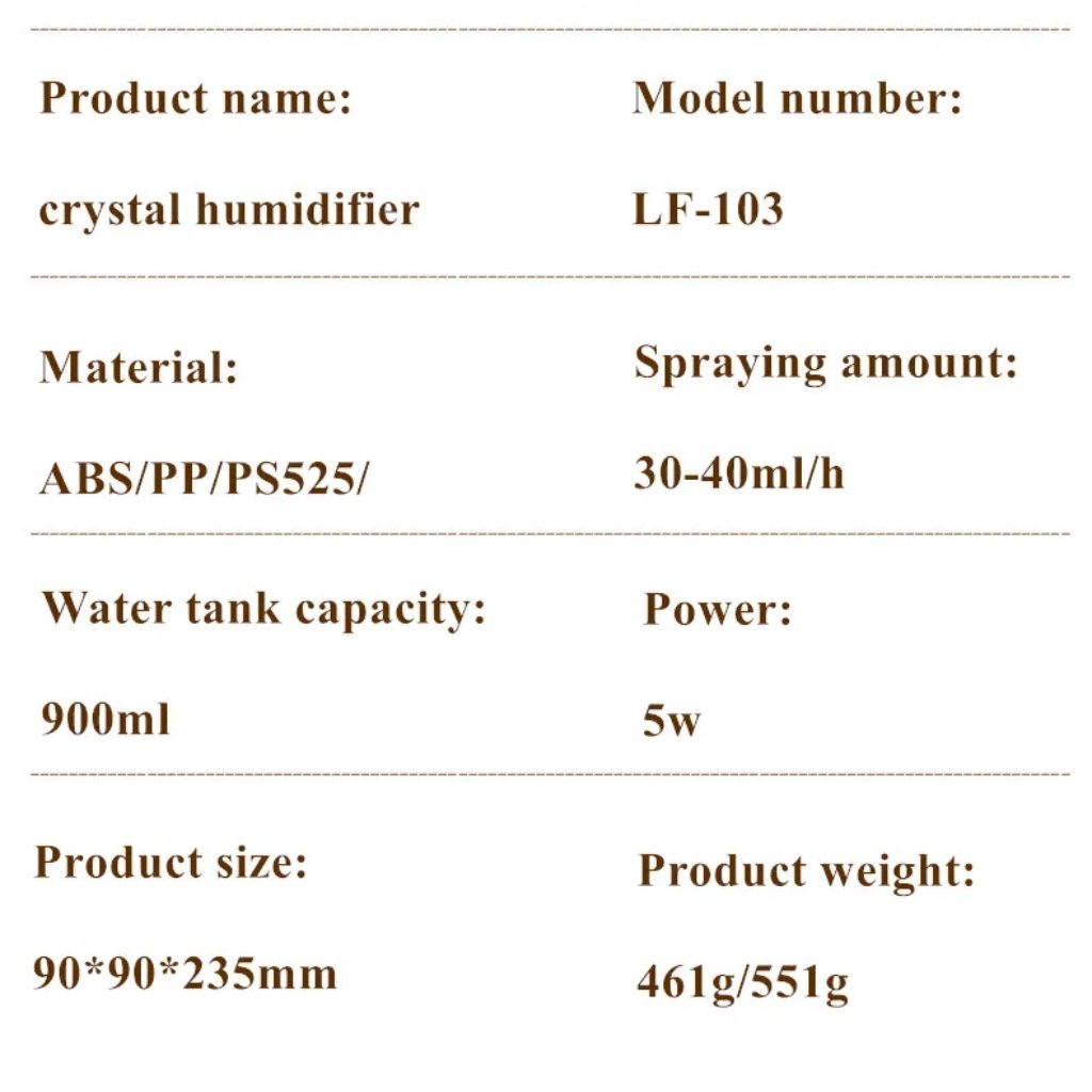 SpécificationNom du produit: humidificateur cristalNuméro de modèle: LF-103Matériau: ABS/PP/PS525/composant électroniqueCapacité du réservoir d’eau: 900mlQuantité de pulvérisation: 30-40 ml/hPuissance: 5wTension: DC5VTaille du produit: 90*90*235mmPoids du produit: 461g/551gCouleur: blanc transparentLe paquet comprend1 * humidificateur1 * câble usb1 * manuel1 * filtre