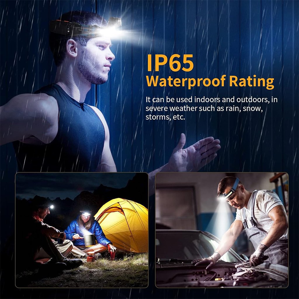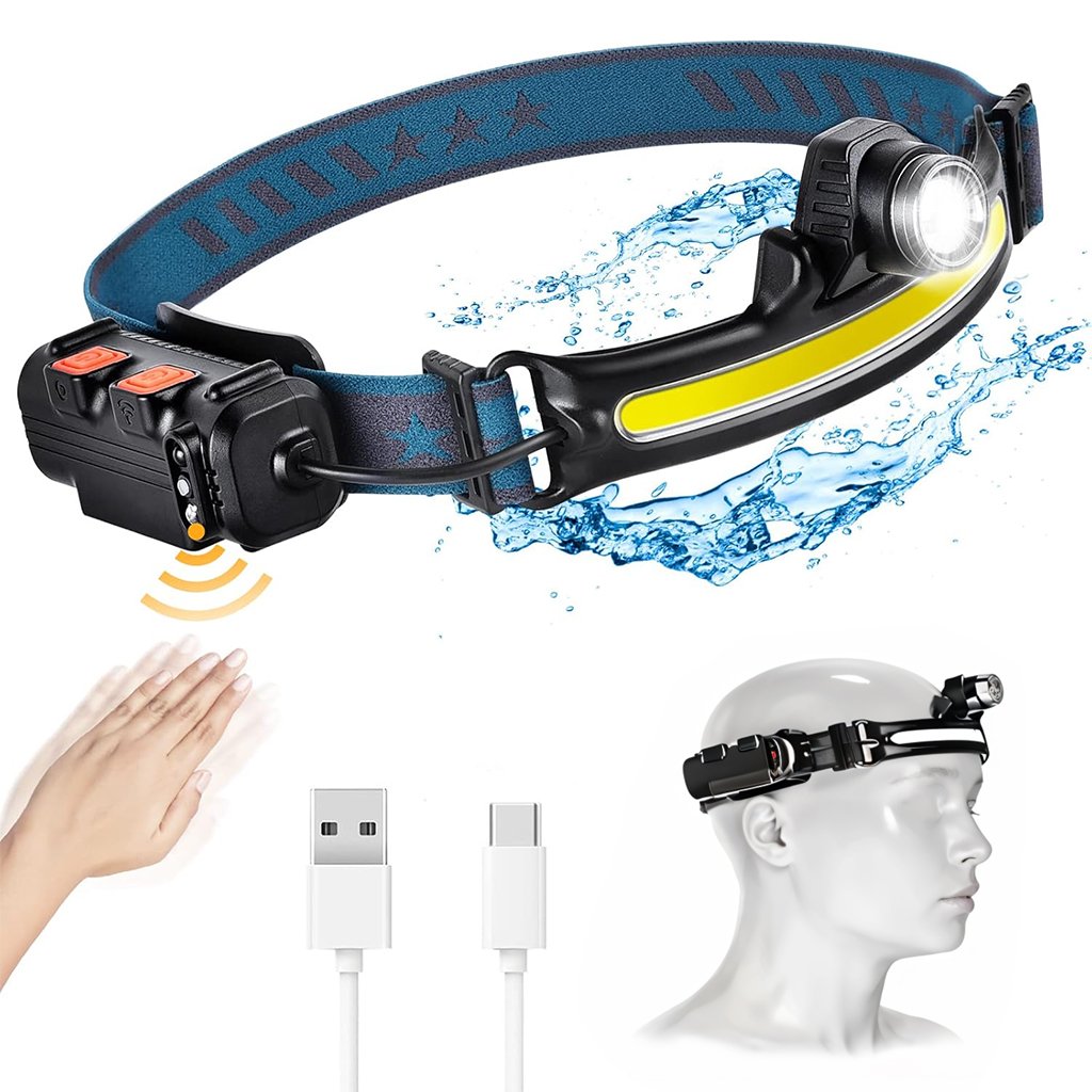 مصباح أمامي متعدد الوظائف (LED): مصباح للرأس بسطوع 600 لومن مع 6 أوضاع إضاءة (قوي/ضعيف/وميض لكل من الشريط والعدسة الأمامية).المواصفات:مستشعر حركة: يمكن تشغيله وإيقافه بتحريك اليد أمامه.زاوية إضاءة واسعة 230°: مع إمكانية ضبط العدسة الأمامية عموديًا 135° ومدى يصل إلى 350 متر.بطارية ليثيوم 2600mAh: قابلة للشحن عبر منفذ Type-C بمدة تشغيل 5-8 ساعات.مؤشر شحن: لمعرفة مستوى البطارية بسهولة.وزن خفيف (131 جم): مع حزام مطاطي قابل للتعديل ليناسب الكبار والصغار.مقاوم للماء IP65: مناسب للاستخدام الداخلي والخارجي (تخييم، صيد، تسلق، إصلاح سيارات، طوارئ).