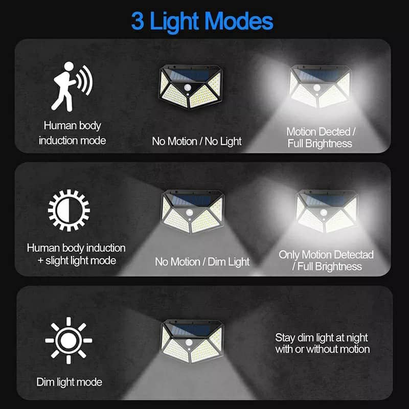 مصابيح شمسية خارجية Hmcity مع مستشعر حركة PIR مطور3 أوضاع إضاءة:وضع الأمان (الإضاءة عند مرور الأشخاص).إضاءة مستمرة طوال الليل.تحكم ذكي بالسطوع (إضاءة خافتة طوال الليل وتزداد عند الحركة).لوح شمسي عالي الكفاءة: خلايا سيليكون أحادي البلورة بنسبة تحويل تصل إلى 20.5٪ لتوليد طاقة أكبر بنسبة 15٪ مقارنة بغيرها.إضاءة أوسع: مزودة بـ 100 LED وزاوية إضاءة 270° لتغطية مساحة تصل إلى 30 متر.مقاومة للماء IP65: مصنوعة من بلاستيك ABS مقاوم للحرارة والتآكل، لضمان عمر أطول.