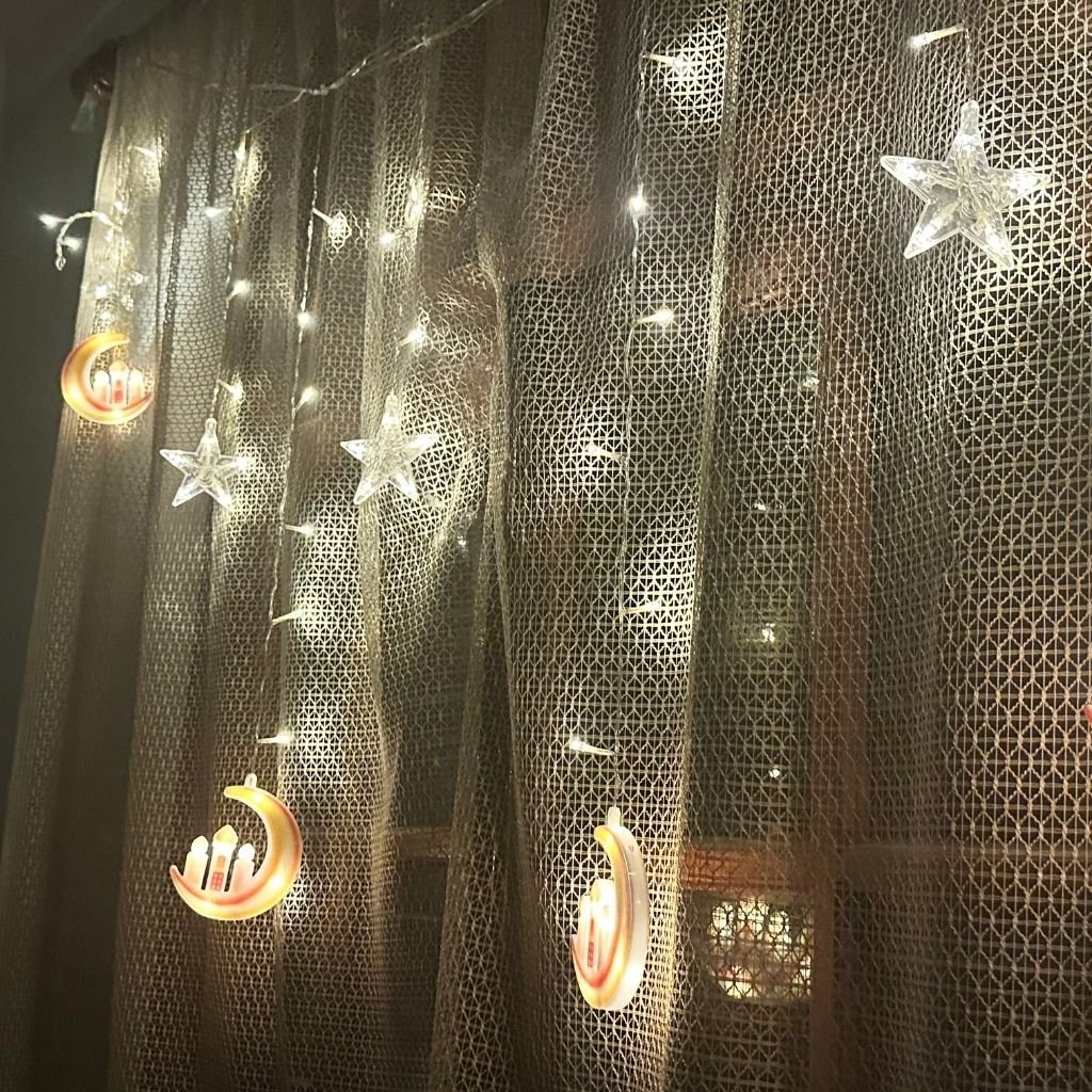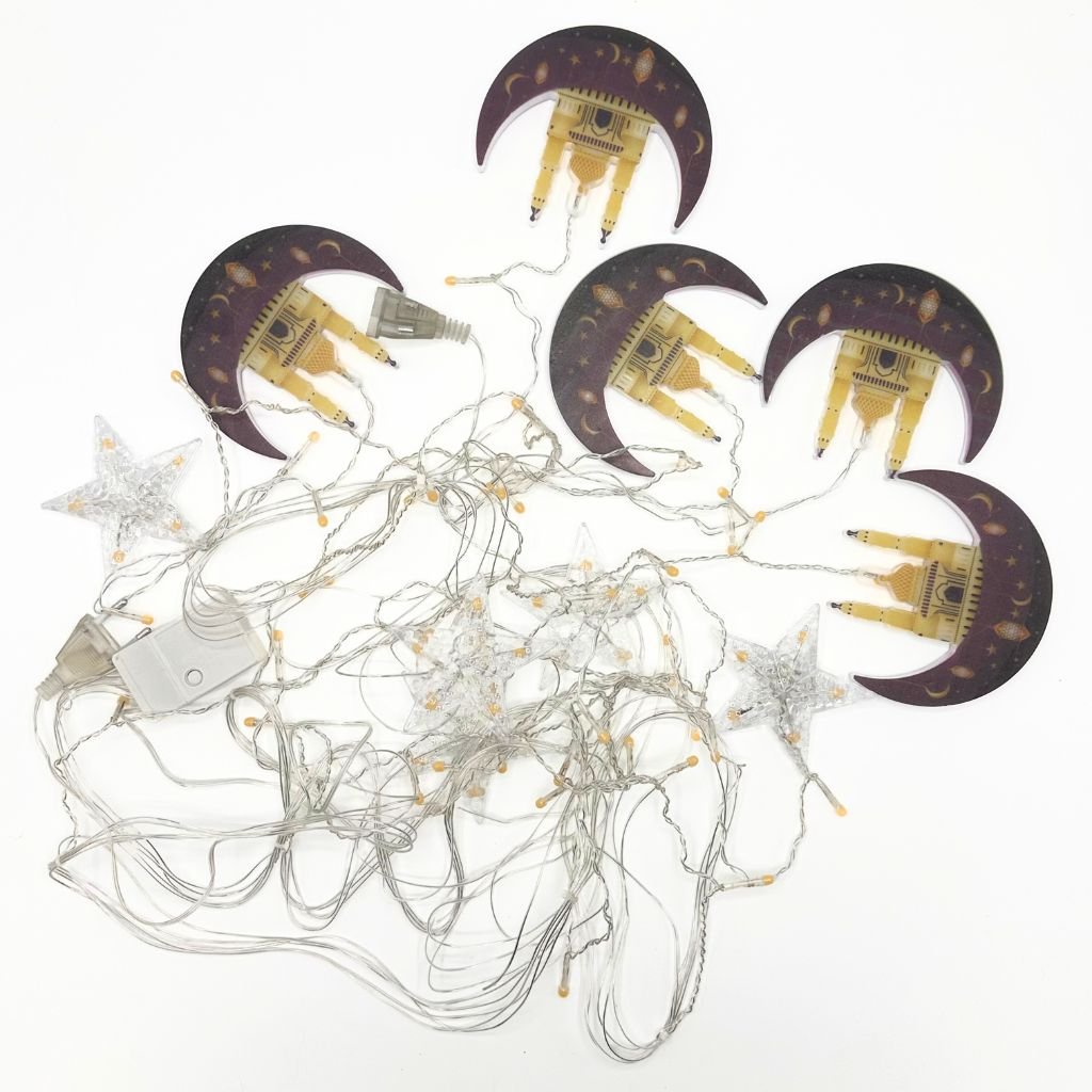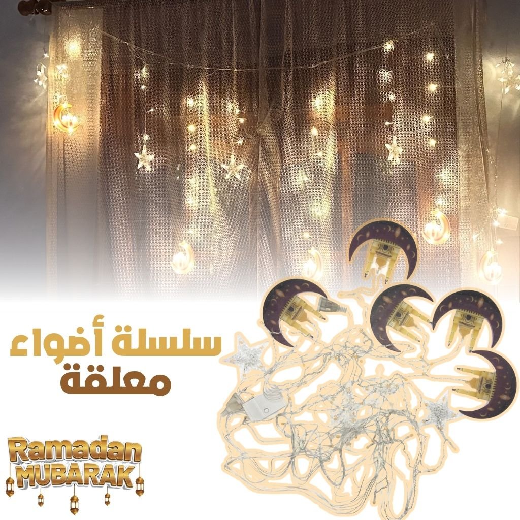 🌙 سلسلة إنارة رمضان مباركتصميم ذو طابع خاص بنقوش الهلال والنجوم التي ترمز لشهر رمضان.إضاءة بيضاء دافئة تمنح أجواء مريحة وهادئة للأمسيات الرمضانية.استخدام متعدد للداخل والخارج لتزيين المنزل أو الحديقة.سهولة التركيب وخفة الوزن لتثبيتها أو لفها حول أي عنصر بسهولة.