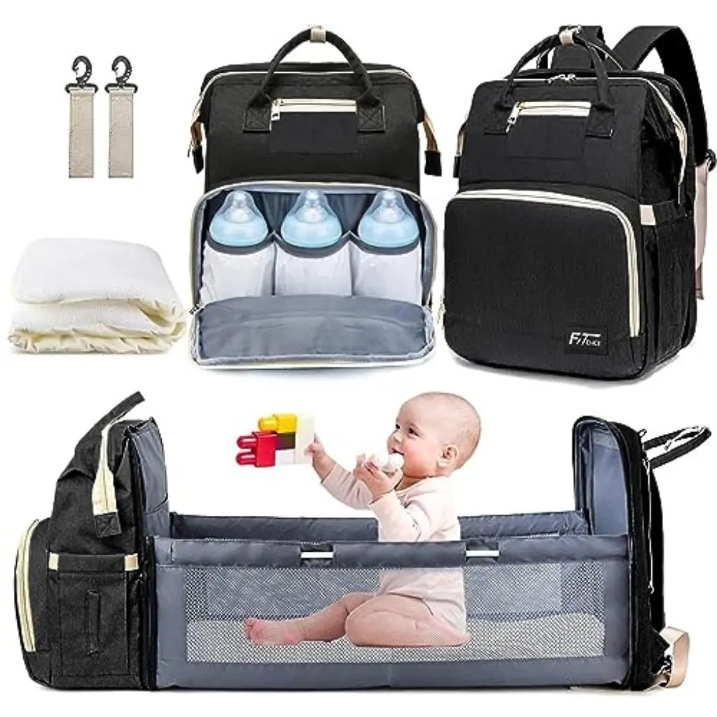 حقيبة حفاضات للأمهات مع سرير قابل للطيالمادة: بوليستر مقاوم للماءالألوان المتوفرة: أخضر / أزرق سماوي / بنفسجي / جمبريالحجم: 32 × 20 × 41 سممحتويات العبوة: حقيبة حفاضات للأمهات + مفرش إسفنجيطريقة طي السرير:فك الدعامة الوسطية أولاً ثم ضعها بشكل مسطح إلى النصف.قبل الطي، اجعل السرير مستويًا واضغط على شكل X بدون عنف.ثبّت السحّاب الخلفي مع الأمامي واسحبه برفق مع التأكد من تثبيت القفل جيدًا.