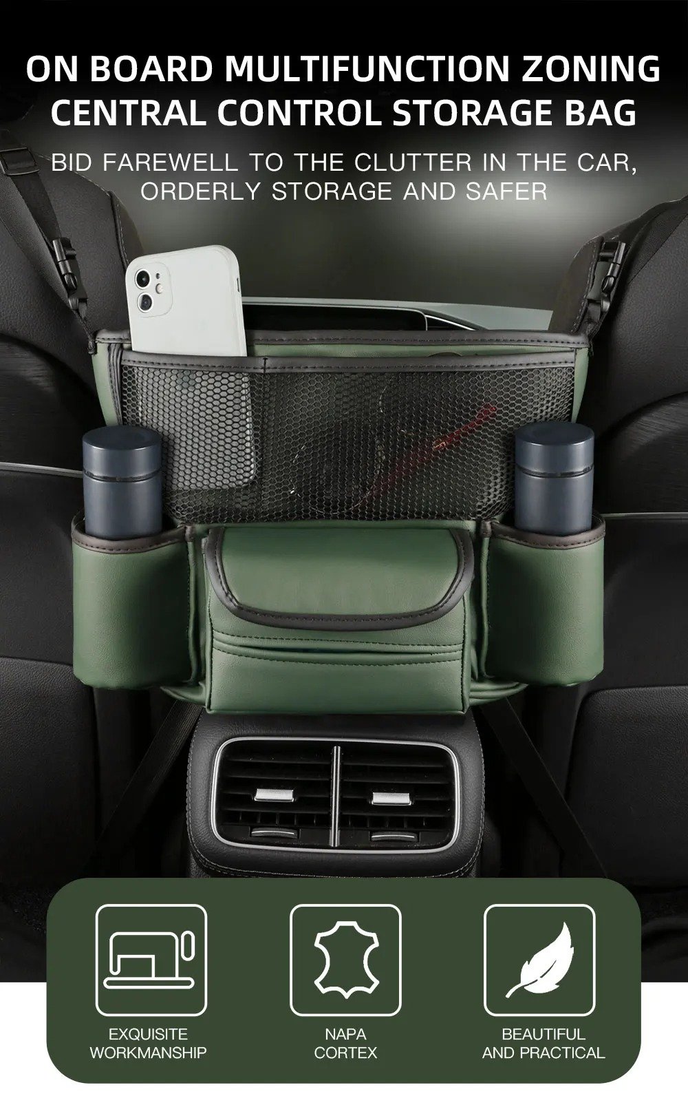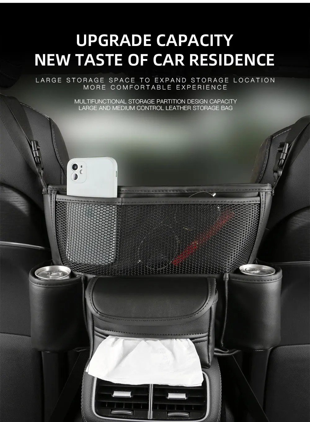Sac de rangement en cuir pour siège de voiture, cintre central, sac à main automatique, support entre les sièges, poches pour gobelets à eau en tissu, évaluation de rangement