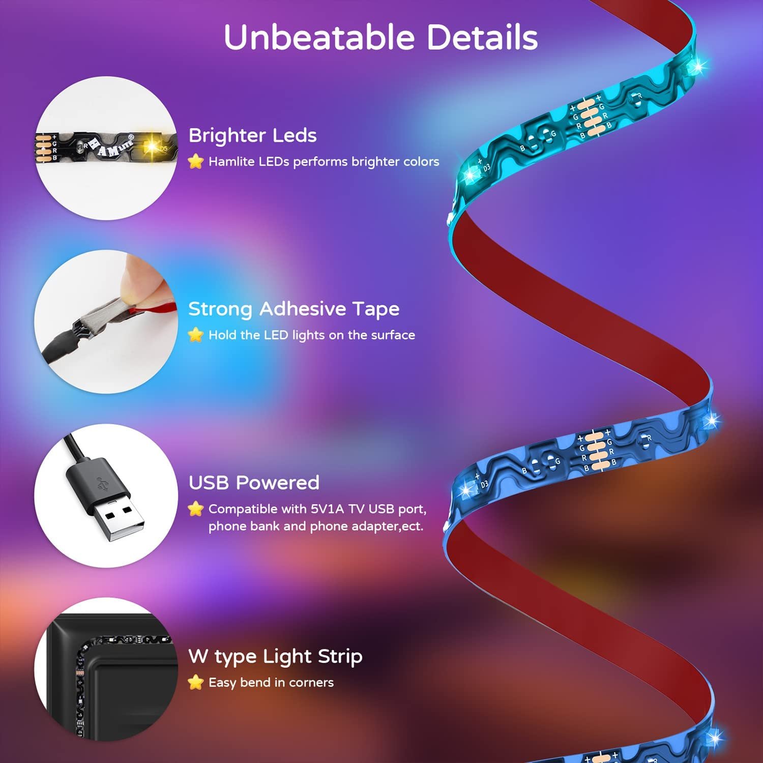 شريط إضاءة LED مع تحكم بلوتوثيعمل عبر منفذ USB ‎5V‎.طول الشريط: ‎5 أمتار.ألوان RGB متعددة.يتزامن مع الموسيقى لتأثيرات ضوئية تفاعلية.