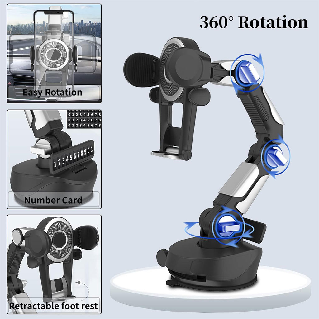 ⭐ المميزات الرئيسية :🔄 دوران كامل 360° : تحكم في زاوية الرؤية كما تحب.📱 متوافق مع جميع الهواتف : يدعم الهواتف الذكية حتى ‎6.8 بوصة.🛡️ ثبات قوي : أذرع مضادة للانزلاق + نظام قفل بالمسمار لضمان ثبات حتى في الطرق المهزوزة.📏 ذراع تلسكوبي قابل للتعديل : يتمدد وينحني حسب حاجتك، مثالي لاستعمال الـGPS أثناء القيادة.🧲 قاعدة شفط قوية : تثبيت آمن على الزجاج الأمامي أو لوحة القيادة.⚡ تركيب سهل بدون أدوات : قابل لإعادة الوضعية في أي وقت.