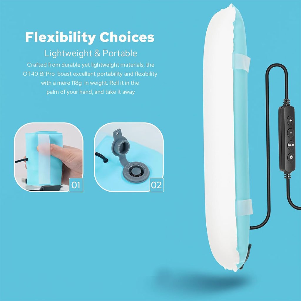 مصباح فيديو LED قابل للنفخ ZENIKO OT40Bi Pro:خفيف ومحمول: مصنوع من مواد متينة وخفيفة، يمكن لفّه وتخزينه بسهولة واستخدامه كمصباح يدوي يومي.مصباح احترافي: يحتوي على 90 لمبة LED بجودة عالية، بإضاءة ثنائية اللون 3000K إلى 6500K، سطوع يصل إلى 992 لوكس، CRI 96+، TLCI 98+.سهل التشغيل ومتعدد الاستخدامات: يعمل عبر كابل USB ويمكن تشغيله من باور بانك أو مقبس حائط، مثالي للتصوير والتخييم والبث المباشر.ميزة حفظ الإعدادات: عند انقطاع الكهرباء وعودتها، يعمل بنفس الإعدادات السابقة. ملاحظة: إذا لم تشتغل الإضاءة بسبب ضعف الكهرباء، اضغط على زر التشغيل 3 مرات لتعود تلقائيًا على أقل سطوع..